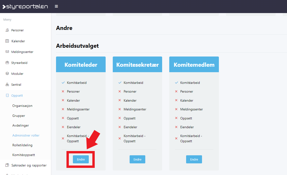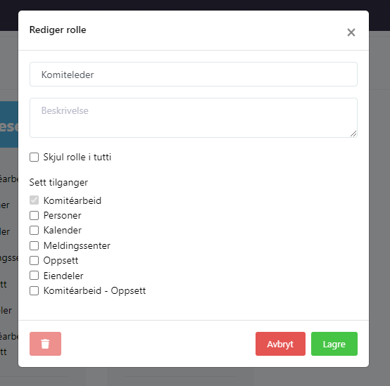 I likhet med andre roller kan du bestemme hvilken tilganger som komité-roller skal gi til personer. Hvis man redigerer tilgangen til en rolle vil dette også endre tilgangene til personer i den rolle.